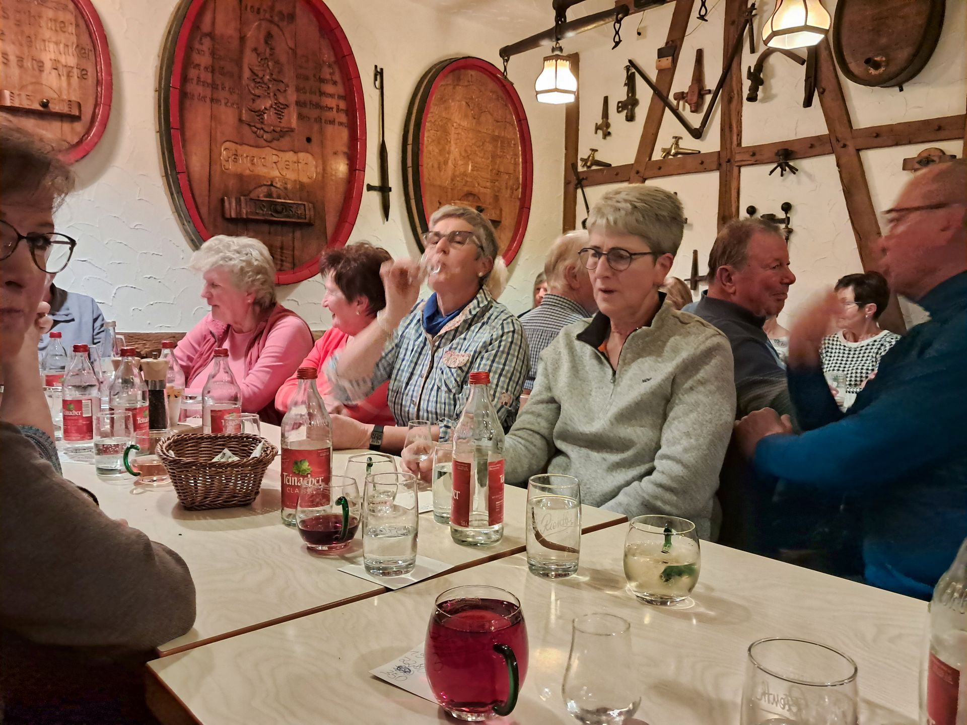 Wandern macht bekanntlich hungrig und durstig. Im Besen "Zom Hasatanz" waren Plätze für uns reserviert. Bei einem guten Essen und einem feinen Wein ließen wir es uns gutgehen. Es gab viele unterhaltsame Gespräche und der Gesang kam auch nicht zu kurz.